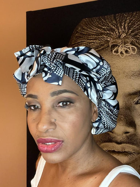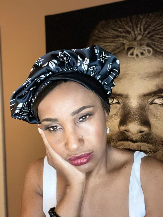 Mama Theresa´s Satin Schlafkappe Schwarz-Weiß Augen -Bogolan Print